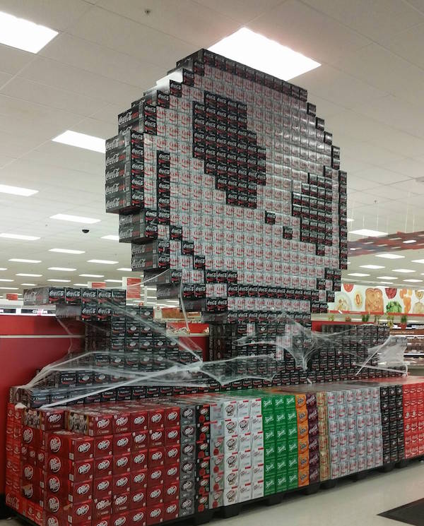 Halloween approche, j’espère que vous avez acheté votre costume pour arbre :). Souvent l’argent n’est pas nécessaire pour faire quelque chose de grandiose, non ce qu’il faut c’est une idée. De quoi vous n’en n’avez pas et vous travailler dans une grande surface ? Et bien dès demain je veux que vous mettiez en place vos canettes de Coca comme ceci: