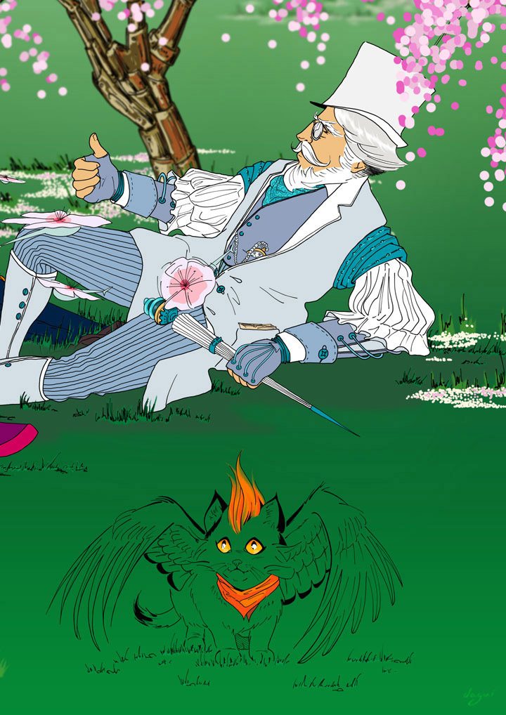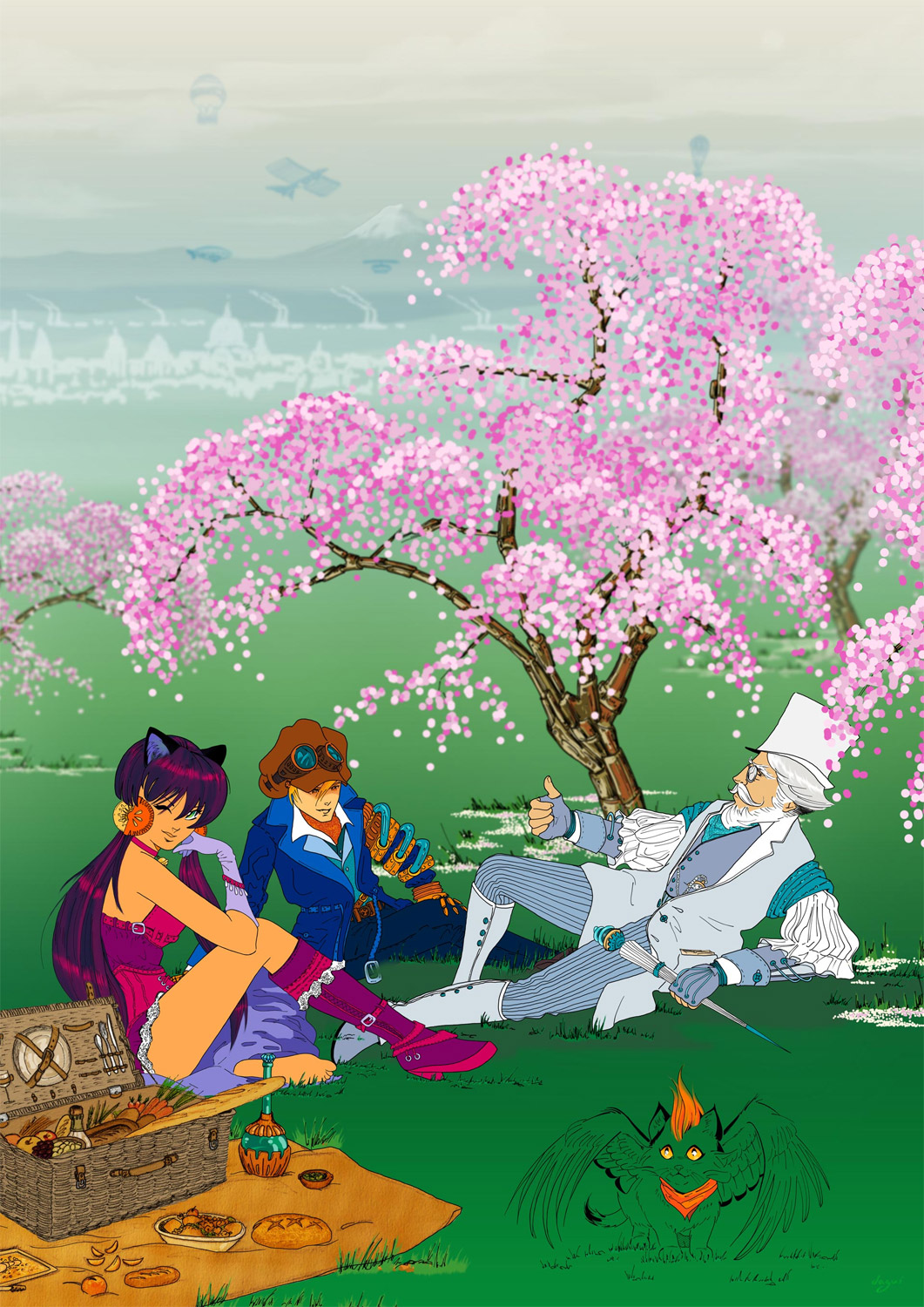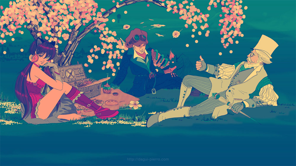 Superbe n’est-ce pas ? J’aime beaucoup le fait d’avoir intégré 3 personnes habillées en Steampunk faisant un pique-nique. Mais pour pouvoir apprécier encore plus ce dessin, je vous invite à aller ici, vous pourrez y voir une superbe animation qui est juste à tomber ! Et puis quoi de plus beau qu’un cerisier en fleurs ? Mais approcher un peu votre tête de l’écran, vous ne voyez rien de spécial ? Oui bien vu, l’arbre est en fait en laiton et dixit l’auteur: