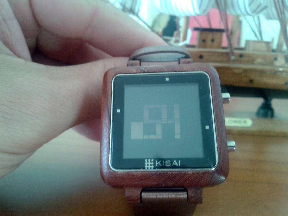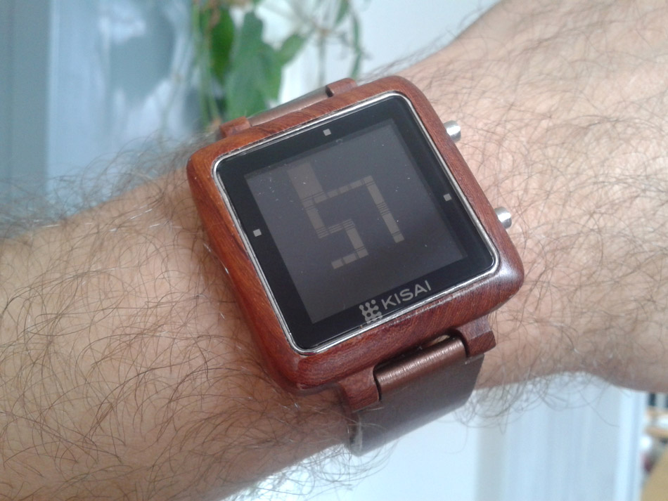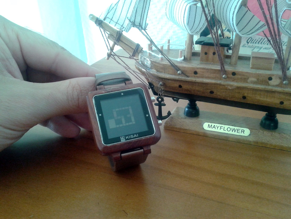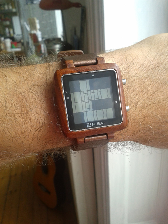 Effectivement, cette montre à l’allure chaleureuse et non dénuée de technologie a une première fonction d’affichage de l’heure quelque peu déroutante, pour ne pas dire obscure (sauf la nuit, il y a un bouton de rétro-éclairage quand-même !) Sur l’écran LCD, des pixels non égaux, en forme de rectangles larges ou plus effilés, soit noirs, soit blanc. Une grille semble organiser le tout d’une façon logique… et là, nous nous confrontons au syndrome que j’appellerai du « kinder » ou du meuble ikea, comme on veut. On se croit plus malin que tout le monde et on essaye de trouver la solution sans se référer à la notice explicative… ne me dites pas que vous ne l’avez jamais fait ! Et au bout de 15 minutes, force est de reconnaître qu’on à assemblé les pièces n’importe comment, ou presque comme il fallait, ce qui est pire, parce qu’il faut alors tout démonter pour mettre la pièce manquante du début !