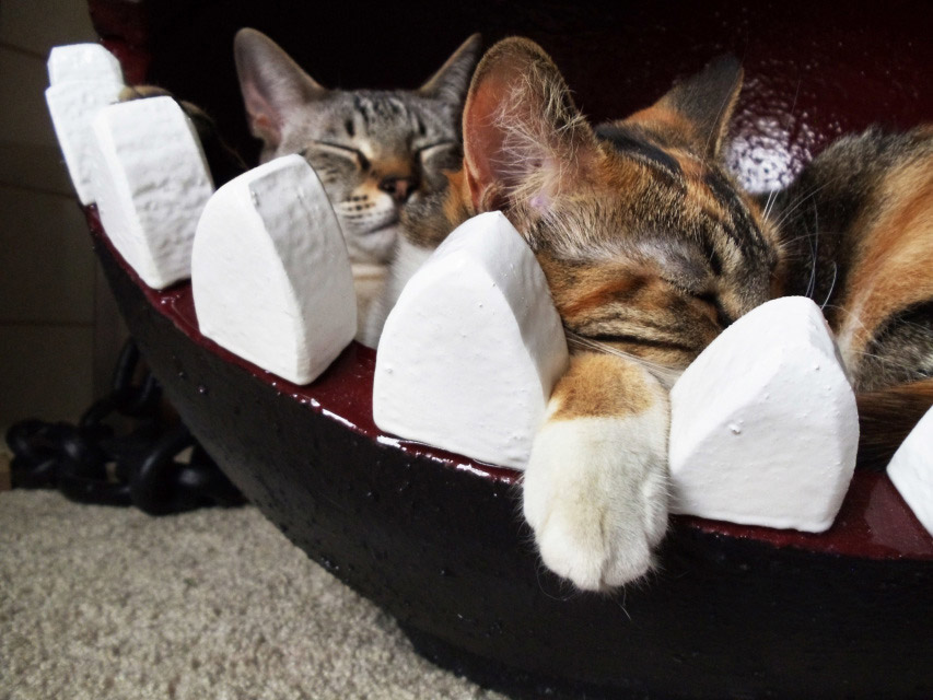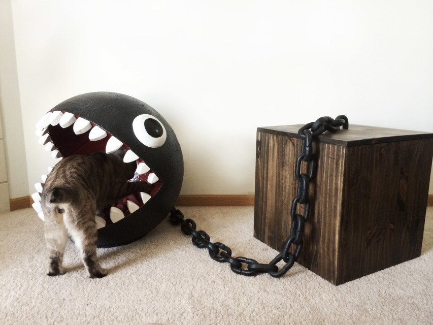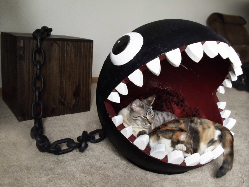 Le principe est simple, le Chain Chomp a la bouche grande ouverte, du coup votre chat peut ainsi s’y coucher dedans: