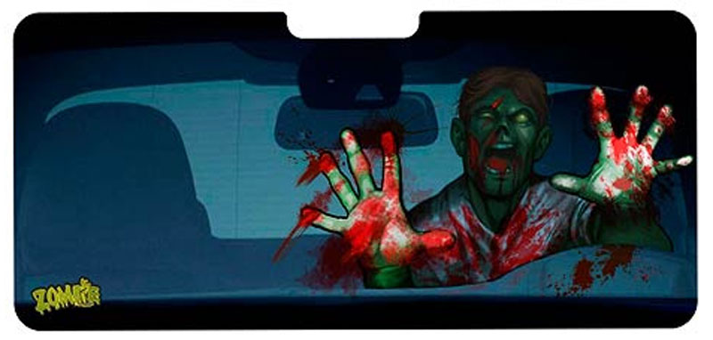 Afin de ne pas trop choquer les personnes qui verront votre pare-soleil, le fabriquant a eu la bonne idée de faire le zombie vert ^^. Mais bon dans la pénombre, voir du sang sur une vitre peut surprendre même le plus costaud.