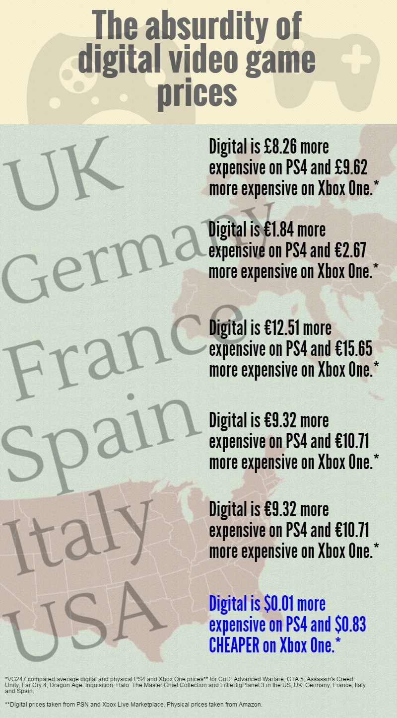 Bref je trouve que les inconvénients sont trop nombreux et pourtant j’ai tout de même des jeux en version démat, oui je suis un peu maso ^^. Mais alors pourquoi les jeux en démat sont si chers ? Commençons tout d’abord par une analyse de VG247 qui montre que la France est simplement le pays le plus pourri niveau tarif des jeux démat, on en a de la chance n’est-ce pas ?