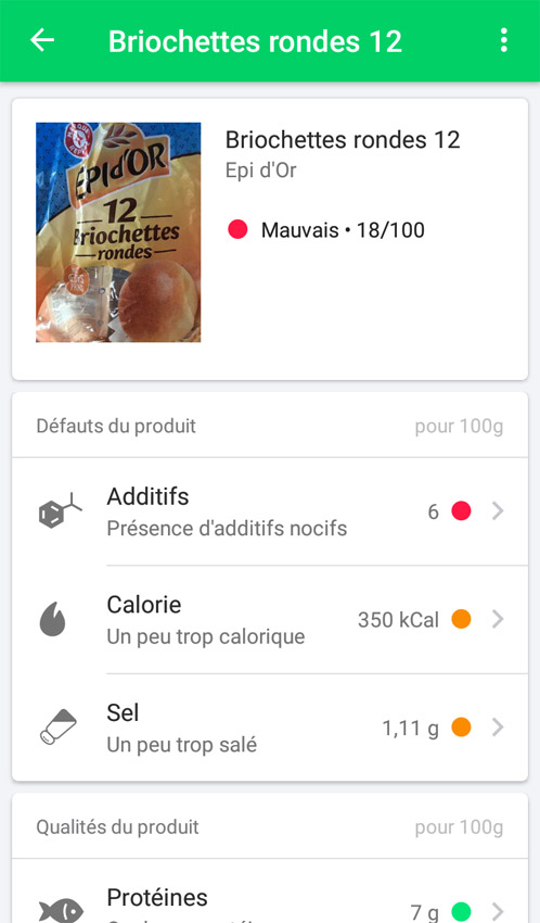 Voici des briochettes que je mange tous les matins avant d’aller au boulot. Euh ok 18/100 c’est pas terrible comme note. En cliquant sur additifs, calorie, sel etc… vous obtiendrez plus d’informations pour savoir la raison de cette note.