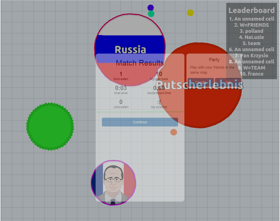 Il est d’ailleurs possible de customiser son ‘personnage’ mais je pense que c’est seulement si l’on créé son compte (rassurez-vous, on peut jouer en mode invité). Au tout début, notre boule est toute petite, du coup on va très vite, mais on se rend vite compte qu’il y a de plus grosses boules qui veulent nous manger (mais ils vont plus doucement). Bref plus vous êtes gros et plus vous allez doucement mais plus vous pouvez manger du monde. Pour grandir vous avez deux solutions: manger les petites billes ou manger les autres joueurs. Mais pour les manger, il faudra être plus gros qu’eux. J’ai éclaté de rire sur ma première partie, voici le joueur qui m’a mangé pour la première fois: