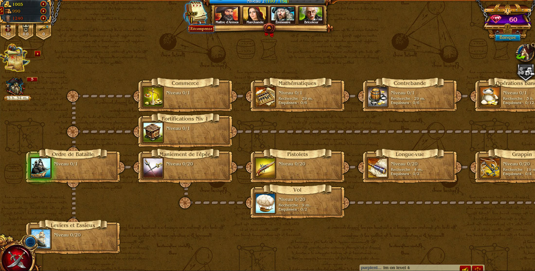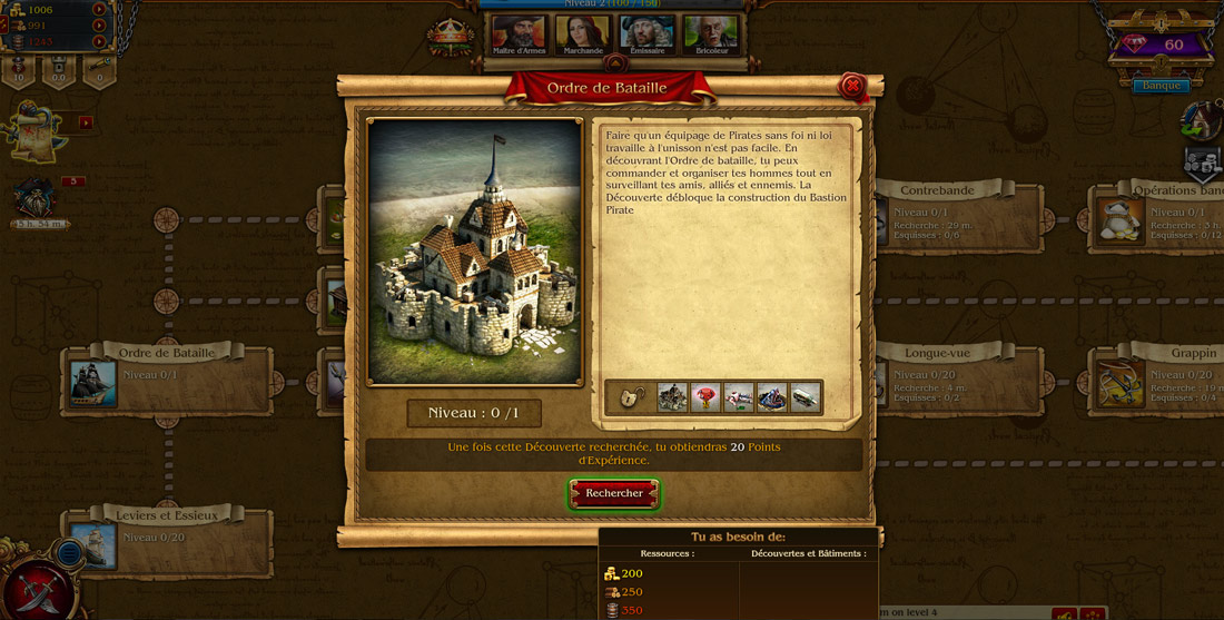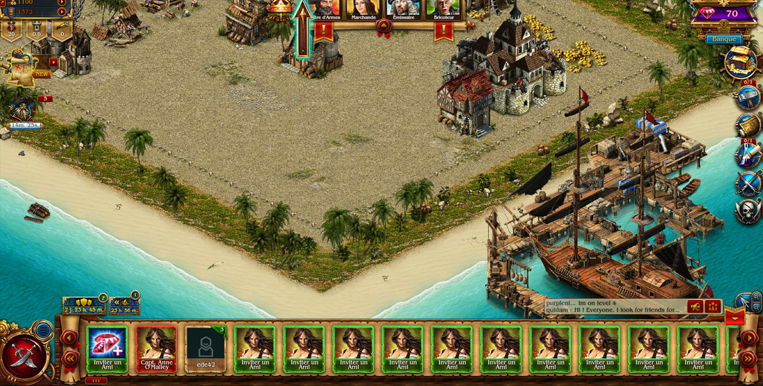 Tout comme un bon vieux Civilization, dans Pirates Tides Of Fortune vous allez devoir faire des découvertes pour améliorer vos troupes et vos connaissances. N’allez donc pas vous lancer dès le début dans une guerre sans pitié, vous risqueriez de vous faire défoncer. Et comme il s’agit d’un MMORTS, vous allez devoir faire équipe avec d’autres joueurs (ce sont les Fraternités dans le jeu). En effet, plus on est nombreux et plus on a de chance de s’en sortir dans ce monde de brutes. Vous pouvez si vous le désirez faire la route tout seul mais vous risquez de vous développer moins vite et surtout de vous frotter à des plus gros que vous.