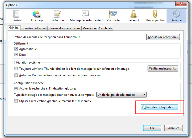 Cela aussi n’est pas forcément clair, mais pour afficher le menu dans Thunderbird, il faut cliquer sur la touche ‘ALT’ de votre clavier. Puis rendez-vous dans le menu Outils –> Options.