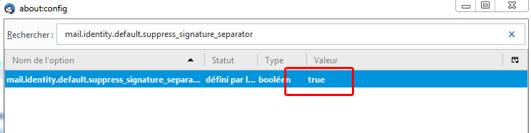 Puis double cliquez sur la valeur ‘False’, elle passera automatiquement à ‘True’ comme sur la photo ci-dessous. Et voilà, les — de votre signature mail auront disparus de Thunderbird.